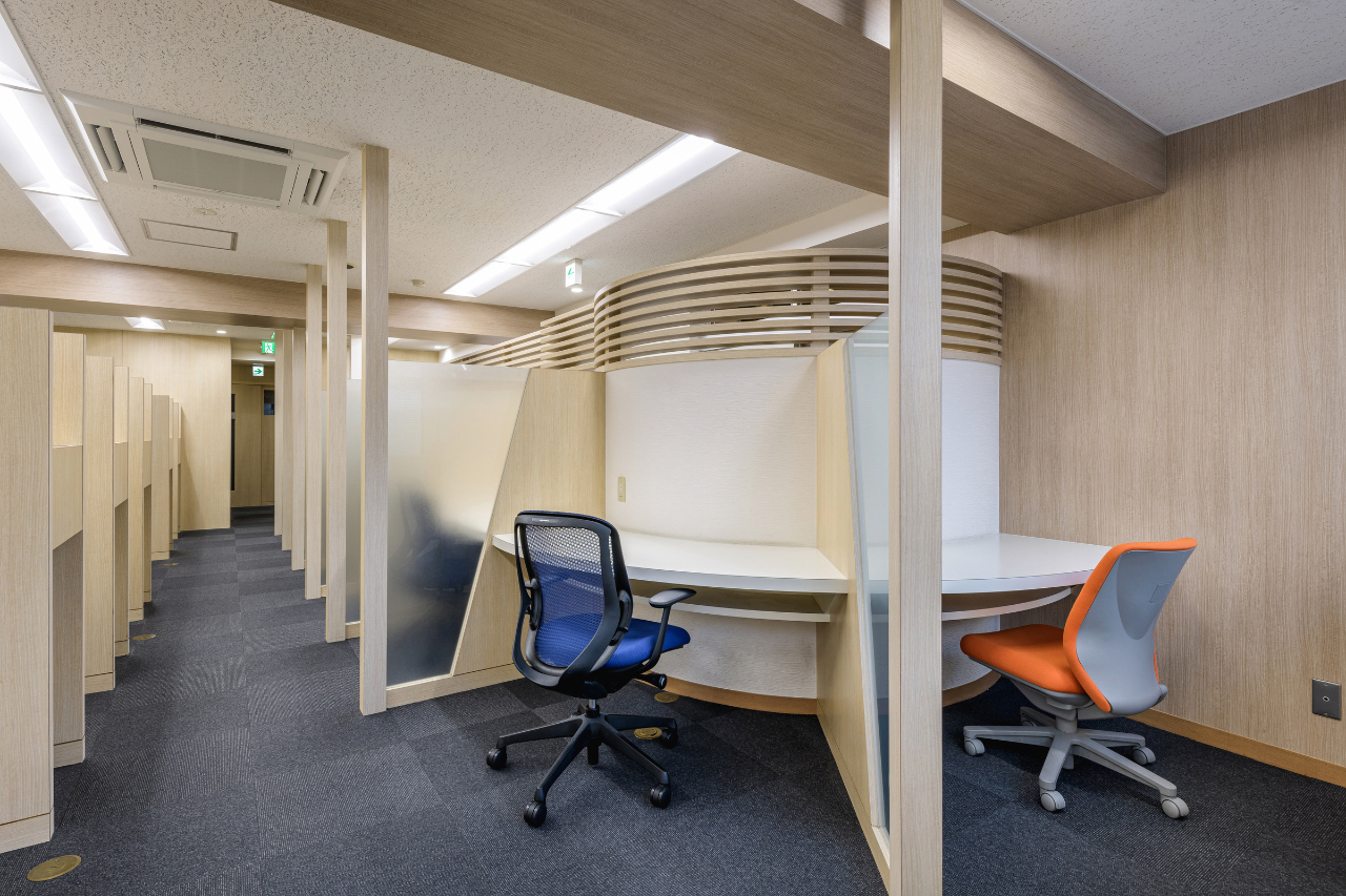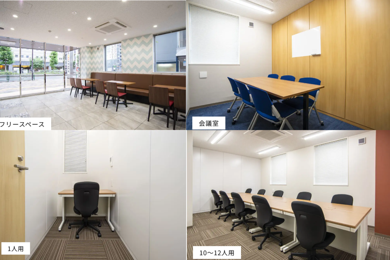 駅から徒歩1分の好立地にあり、24時間利用可能なコワーキングスペースです。半個室やモニター付き席、静音ブースなど用途に応じた席が用意されており、会議室も予約できるため、テレワークや起業準備、法人登記を考えている方に幅広く対応しています。