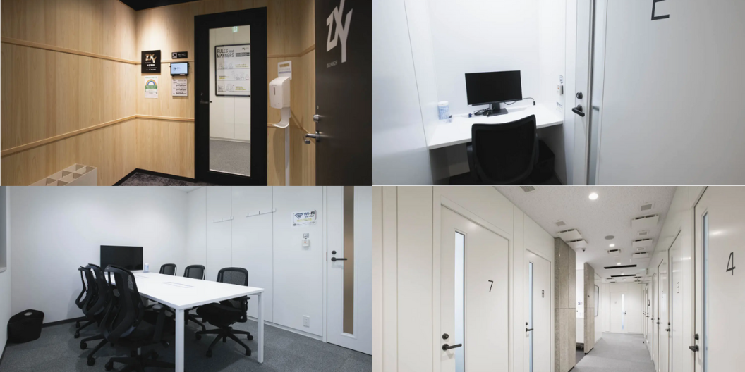1名様用の完全個室が12室、1名〜4名様で利用できる会議室が1室あり、用途に合わせてご利用いただけます。 利用可能時間は朝の7時から夜23時45分までです。