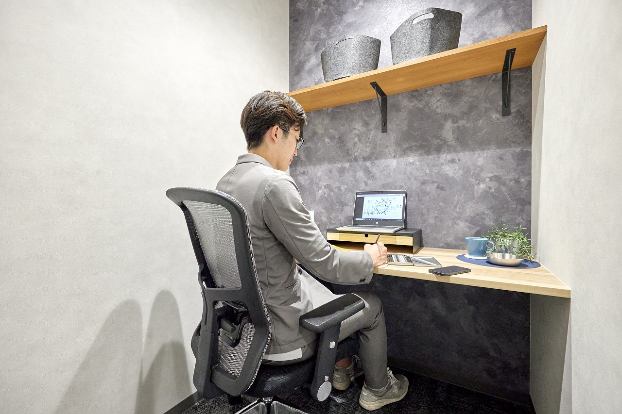 仕事に集中でき、WEB会議にも対応する「個室」中心のレイアウトで、長時間使用しても疲れにくいチェアを完備しています。キーレスでスマホが鍵の代わりになり、電話、受付手続きが不要で誰とも接触せずにご利用可能となっています。