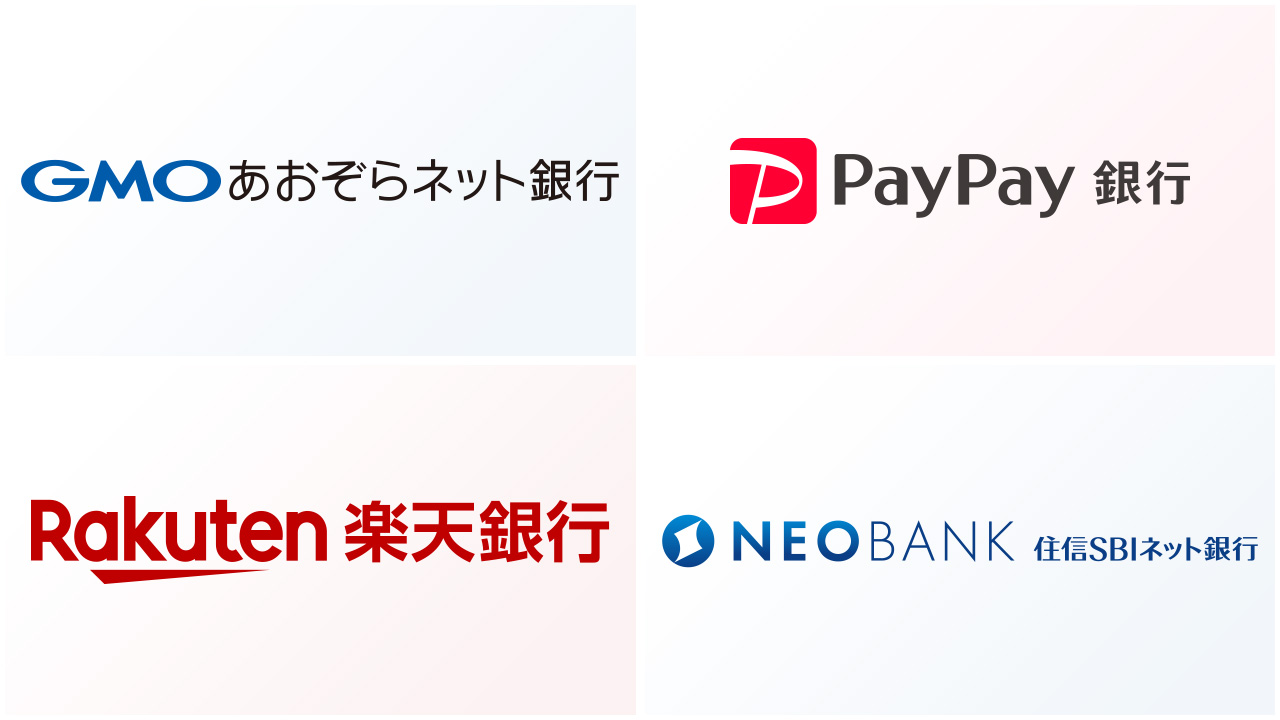 | 銀行名 | GMOあおぞらネット銀行 | 住信SBIネット銀行 | 楽天銀行 | PayPay銀行 |