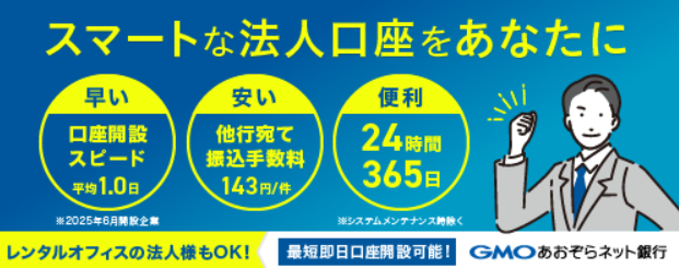 - 設立1年未満の法人なら他行宛月20回(合計260回)無料