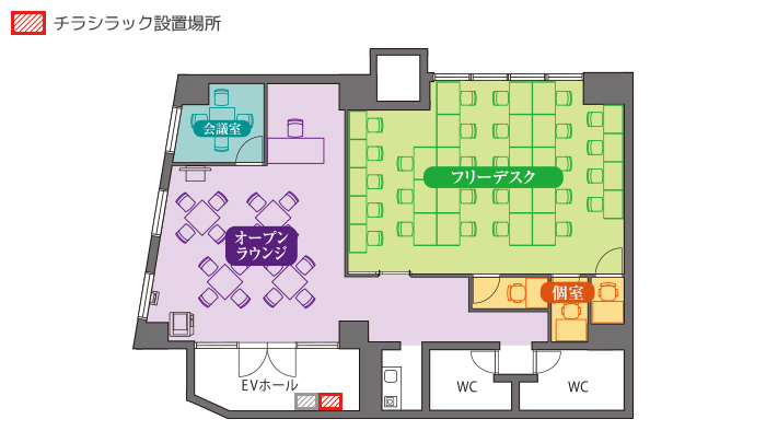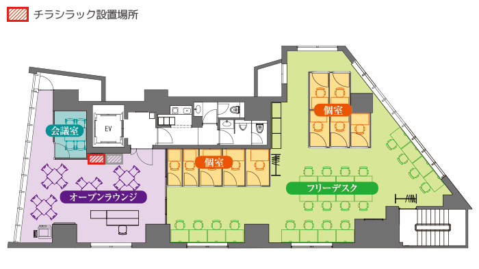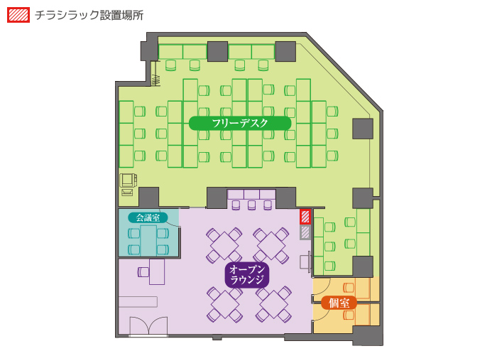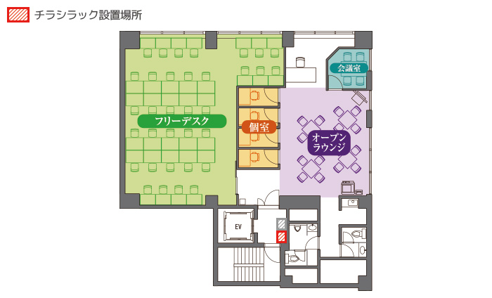 チラシ設置広告プランをご利用いただくことでアントレサロン内のチラシラックに、御社のチラシを設置いただけます。チラシラックは、アントレサロン会員様が商談・休憩時に利用するオープンラウンジにあるので、多くの方の目に留まりやすいです。