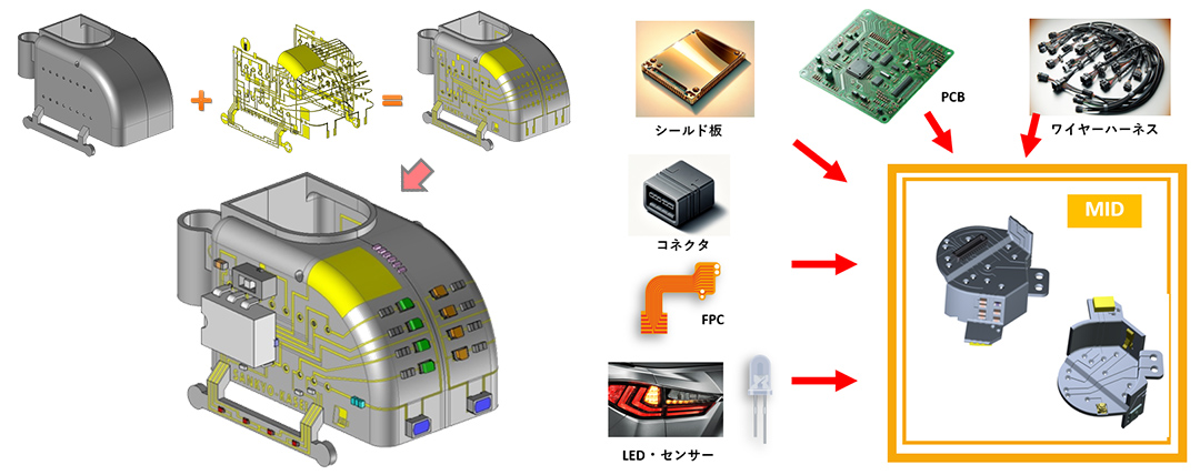 「MID」とはプラスチック加工のひとつである、射出成形品(金型にプラスチック等を流し込んで作成する製品)に配線を施した製品ですが、これに「三次元配線」された製品を三次元(3D)MIDと呼んでいます。