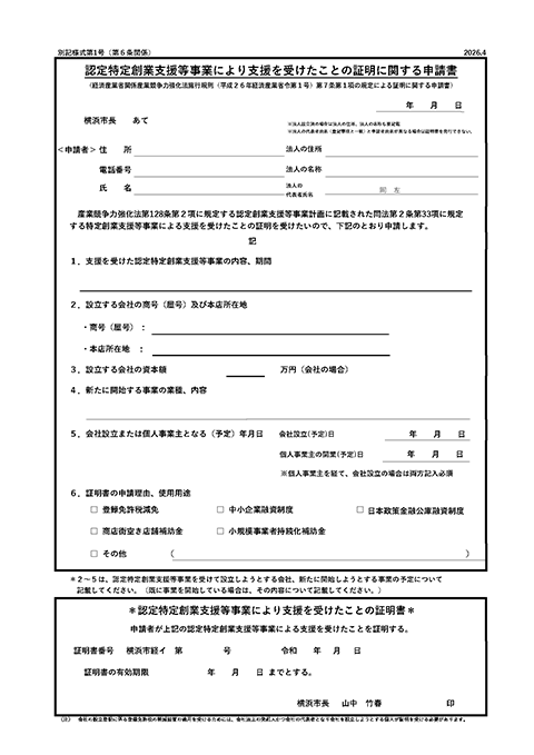 認定特定創業支援等事業により支援を受けたことの証明に関する申請書