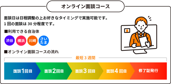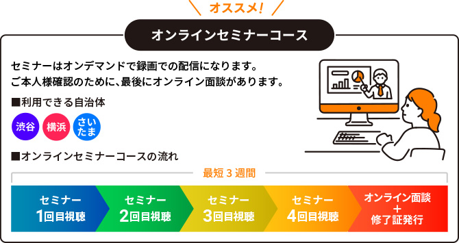 好きなときに視聴できるオンデマンドセミナー受講(全4回)と、ご本人確認のオンライン面談(1回)で修了するものです。