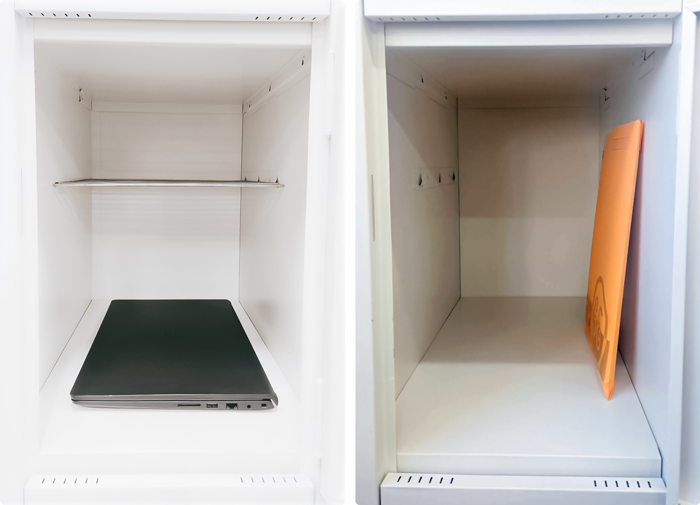 ロッカーの中の仕切りは外せます。ノートPC(B4サイズ)、角2封筒も入ります。