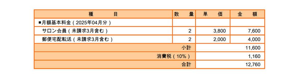 例)3月1日に申込し、3月に利用開始した例 3月10日にお送りする請求書では、原則4月分のご請求書になりますが、3月分の利用料が追加されるため、(未請求3月含む)と表示しています。そのため数量も3月分と4月分の「2」になります。