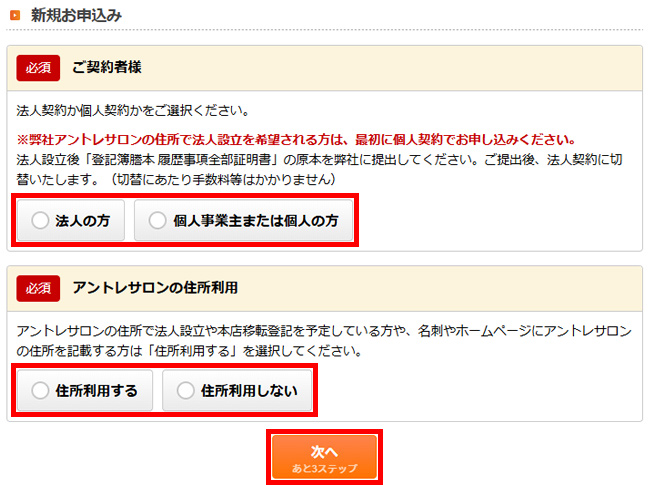 ②2契約目の目的に応じて「法人・個人」「住所利用あり・なし」を選択し、「次へ」を押してください。