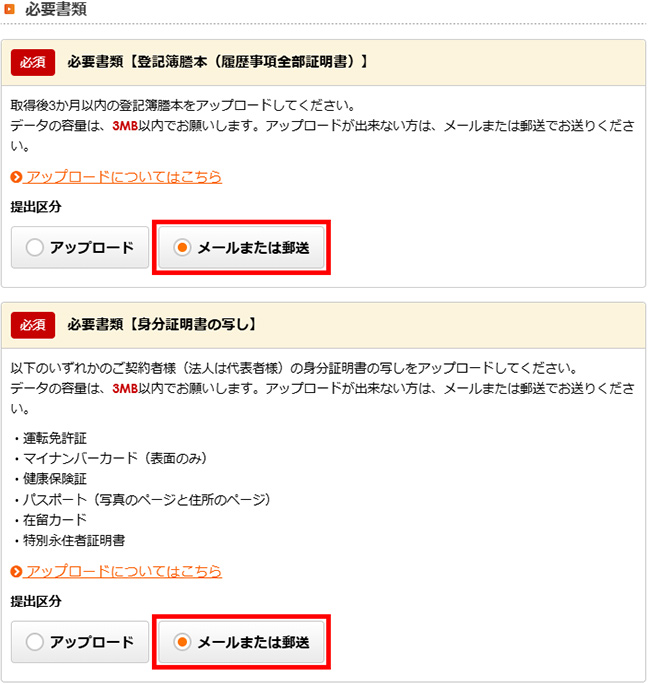 ④必要書類の項目は全て「メールまたは郵送」を選択してください。