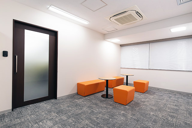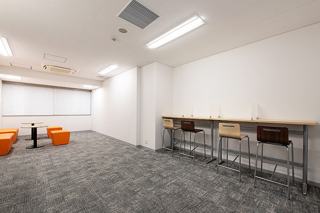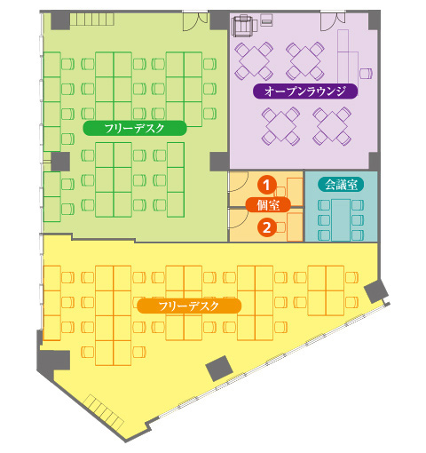6名の会議室が1つ、無料のオープンラウンジ、フリーデスク(私語禁止エリア36席・私語OKエリア47席)、個室2部屋をご用意しております。