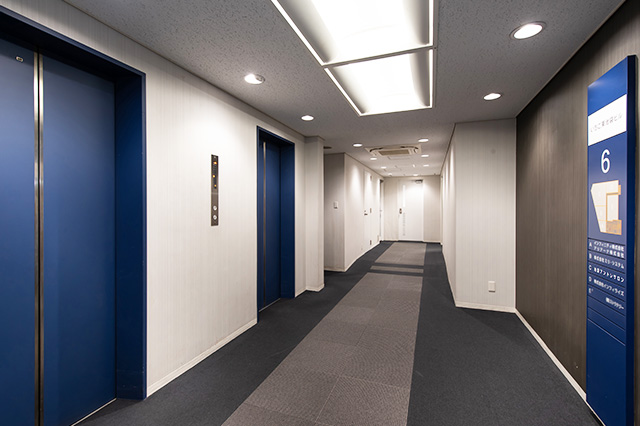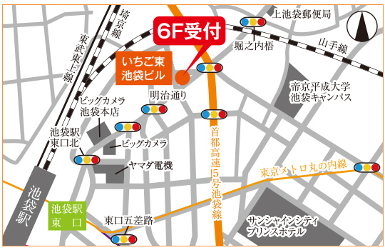 池袋駅より徒歩5分、明治通り沿いの角地のビルの2階と6階です。受付は6階にあります。