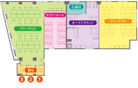 常駐のスタッフが、御社宛の来客を受付致します。フリーデスクは、会員様同士の打ち合わせや電話をしながら仕事ができるエリアと、集中してお仕事をしたいときなどに適した私語・電話を禁止しているエリアがあり、