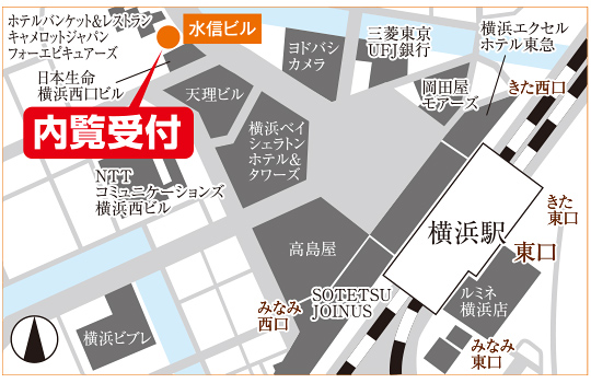 横浜駅から徒歩4分、横浜駅西口・ジョイナス地下1階西口中央通りから直結の水信ビル(ミズノブビル)にあります。受付は7階です。