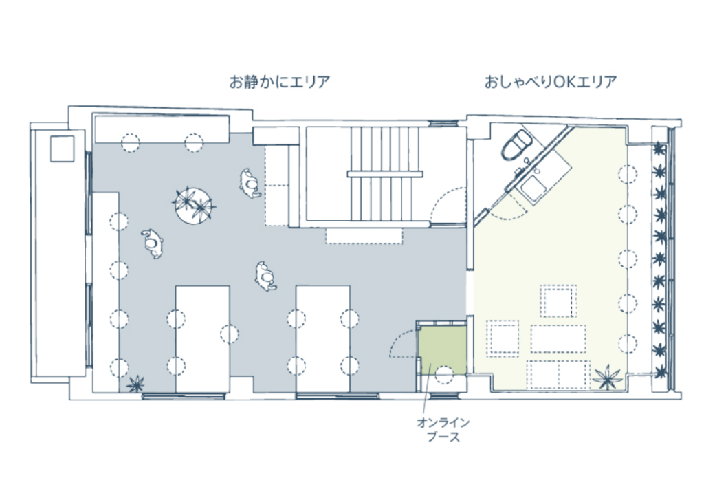 | 特徴 | 静かにもくもくと作業をする人のための「お静かにエリア」と、打ち合わせや電話、メンバーさん同士のおしゃべりができる「おしゃべりOKエリア」に分かれています。 個室の「オンラインブース」も1ブース設置しています(予約制。冷暖房がないため、夏季・冬季は使用に適さない場合があります)。 |