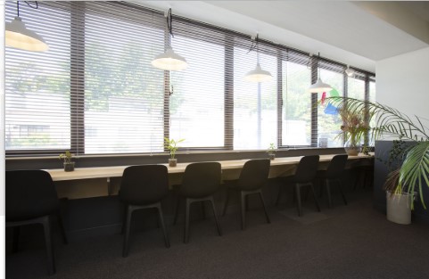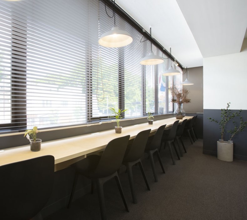 座席間のゆとりを優先したオープンスペース、全面窓で明るいカウンター席、各室とも広めの空間が確保された専用個室のオフィスエリア。使途によってスペースが分かれているので快適にご利用いただけます。