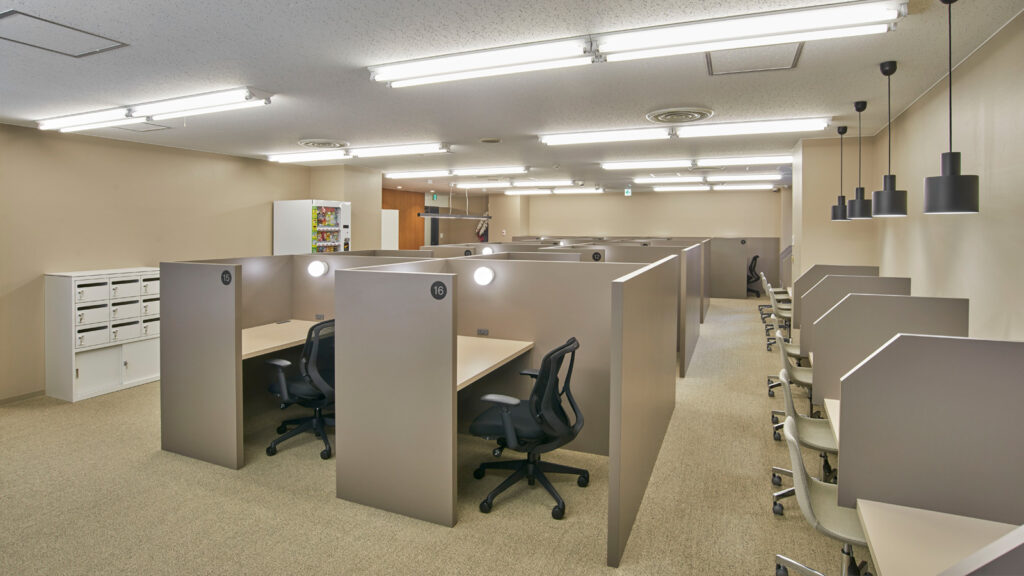 | 特徴 | 全19席のオープン / ブースに、鍵あり・モニターありの会議室や着席個室ブースが15分単位でご利用いただけます。複合機やWi-Fi、TELブース、フリードリンクなど設備が整っております。 |
