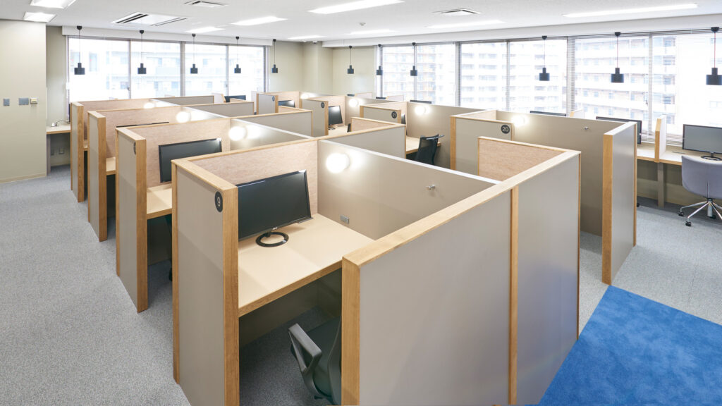 | 特徴 | 全41席のオープンブースと鍵あり・モニターありの会議室や着席個室ブースが15分単位でご利用いただけます。(着席個室ブース専用店舗)複合機やWi-Fi、TELブース、フリードリンクなど設備が整っております。 |