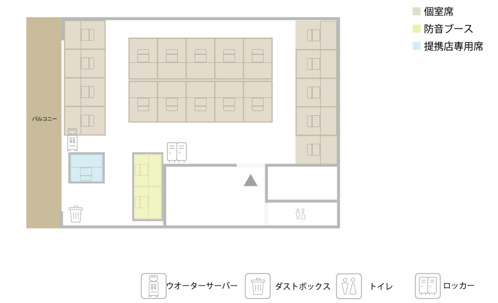| 特徴 | 19席の個室と2席の防音ブースを完備。 コンパクトな施設ながら、仕切られた空間で仕事や勉強に集中いただけます。 |