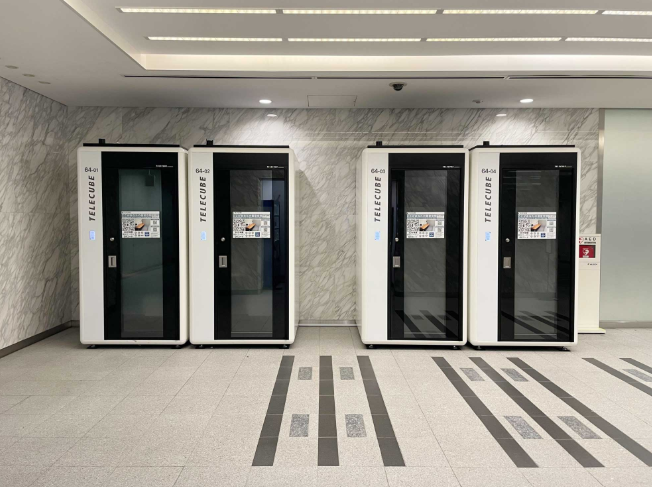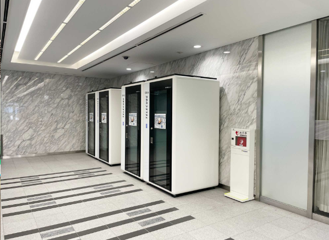 いつでもどこでも快適にお仕事ができるよう、全国各地に設置されたリモートボックスです。スマホ1つで予約、ロック解除が可能です。ボックス内は声や音を遮断する防音設定になっており、周囲を気にせず会話やオンライン会議が可能です。セキュリティ・プライバシーが確保された静かな個室空間で、集中して作業できます。ボックス内には、電源やUSBポートが完備されています。