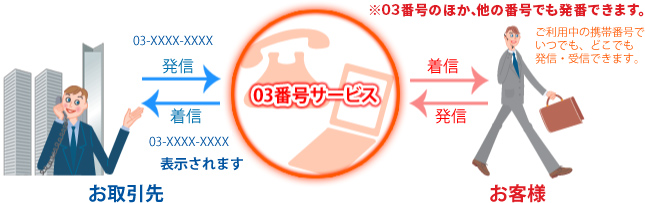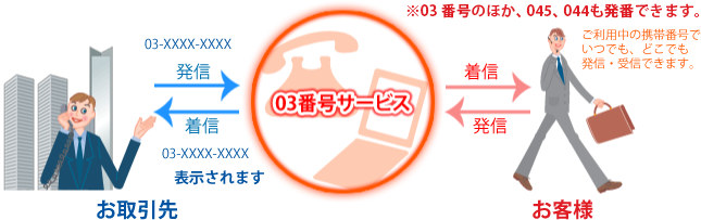 専用電話番号(03、045、044、048)宛にかかってきた電話を、お客様ご指定の電話(固定電話や携帯電話)に自動転送するサービスです。また、お客様の携帯電話や固定電話の電話機からかけて、相手先には御社の専用電話番号(03、045、044、048)が表示されるように発信することもできます。
