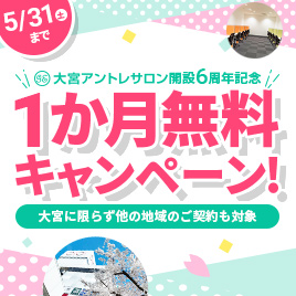 おかげさまで開設6周年!1か月無料キャンペーン 平素は格別のご愛顧を賜わり、厚くお礼申し上げます。 「大宮アントレサロン」は、今月で開設6周年を迎えました。 これもひとえに皆様のご協力とご支援のたまものと深く感謝しております。 開設…